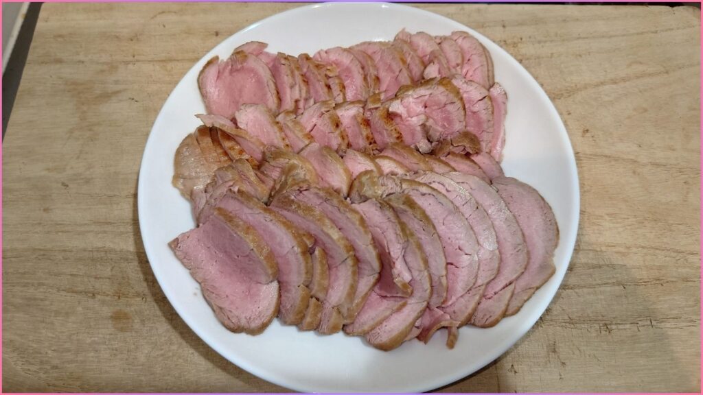 - 15分ほどしたら、取り出します。粗熱が取れるまで置いておきます。熱が残っている状態であると、薄くスライスするのが難しいためです。粗熱が取れたものを冷蔵庫などに入れておくと、さらにスライスしやすくなります。